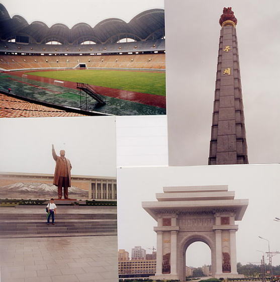 ピョンヤン観光の定番!!東京ならば東京タワー・皇居といったところか?左上より、北朝鮮名物のマスゲーム開催で知られる、収容人数15万人というメーデースタジアム・右上は主体思想塔・左下は金日成銅像・右下は凱旋門。