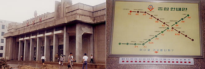 左は地下鉄『復興駅』。それにしても、地下鉄駅本体は地下深くにあるというのに、地上に結構立派な建物が建っているのは何故でしょう!?右はピョンヤン地下鉄の路線図。