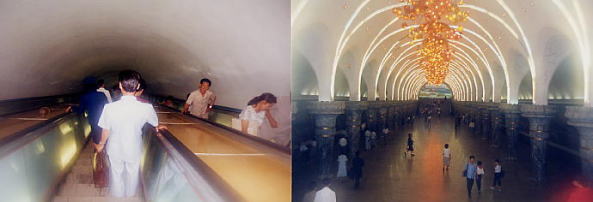 地下鉄ホームへは、吸いこまれそうなほど急なエスカレーターを降りて行きます。駅は豪華な作りで見栄えがしますが、外国人観光客見学用の駅のみ豪華に造ってあるとの話もあります。なお写真にもやがかかって見えるのは、レンズが曇ったためです。