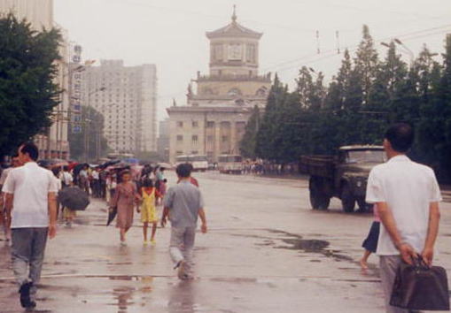 雨に煙るピョンヤン駅と人々