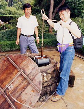 “主席様が水汲みをされていた井戸”にて、若かりしのりまき(笑)。後ろはガイドの金さん。お水も飲んでみました。結構美味しい水でしたよ。