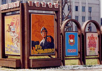 北朝鮮では、金日成・正日親子が訪れたところには必ずといって良いほど“来訪記念看板”があるようです。上の写真は板門店のもので、“親愛なる指導者”金正日同志様が1972年7月19日から1977年7月3日までの間に、3回訪問されたという内容だそうです。