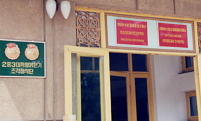 この写真はちょっと解説が要るでしょう。建物入り口の上にある赤看板は、この建物に金日成がやってきたことを示す看板(左)と、金正日がやってきたことを示す看板(右)です。左側にある、緑地の上にメダルのようなものがデザインされている看板は、ここの建物の中の団体が、ニ度“三大革命運動《注2》”で表彰の栄誉に輝いたことを表わしています。