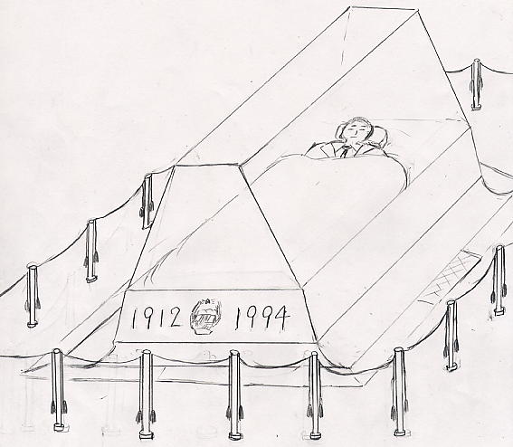 部屋は薄暗く、ほのかな明かりの中、ガラスケースの柩の中に、赤い布に包まれて主席は眠っています。