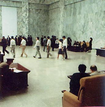 実は!!これから先が結構長いのです!!これから延々と、生前の金日成主席が訪問した場所を電光掲示板で表示するなど、主席の国内外での活躍についての展示や、主席の死を悲しむ人民を描いた巨大なレリーフなどの見学が続くのです。特に巨大レリーフ見学時には記念宮殿側の女性ガイド(黒地に金糸と銀糸の刺繍がされたチマ・チョゴリ姿)が、各団体に一人づつ付いて、長々とした説明をします。(もちろん外国人には、外国語の話せるガイドが付く)