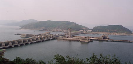 これは北朝鮮の観光ガイドほとんど全てにある定番ショット。西海閘門の光景です。