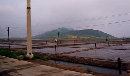南浦郊外に広がっている塩田の光景です。昔、日本にあった塩田と同じく、海水をここに引き入れて蒸発させ、濃い食塩水を作ってそれを煮詰めて塩を作るのだと思われます。それにしてもここで作った塩を食べてみたい!!