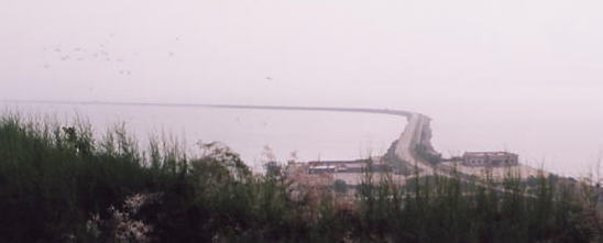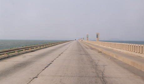 展望台から見た西海閘門の光景。海の上に道を作ってしまった状況がわかると思います。