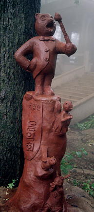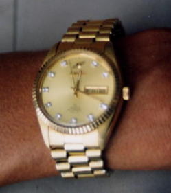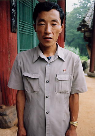 月精寺の管理人さん。彼はこの寺を訪問した金正日国防委員長(!)から、『朝鮮の大切な文化遺産である月精寺をしっかり守っている愛国者』であると誉められ。金時計をプレゼントされたという。右はその“金正日様恩賜の金時計!!”