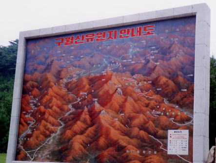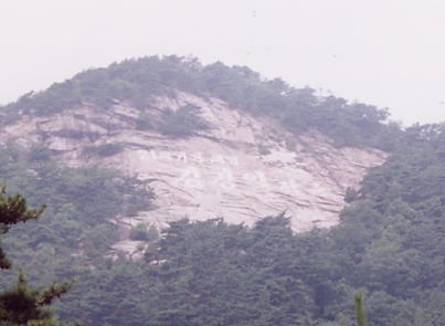 読みにくいですが……山の絶壁にも刻まれる“21世紀の太陽、金正日将軍万歳!”