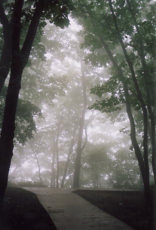 霧に包まれ、幻想的光景を醸し出している九月山山頂近く。とっても涼しく快適!!