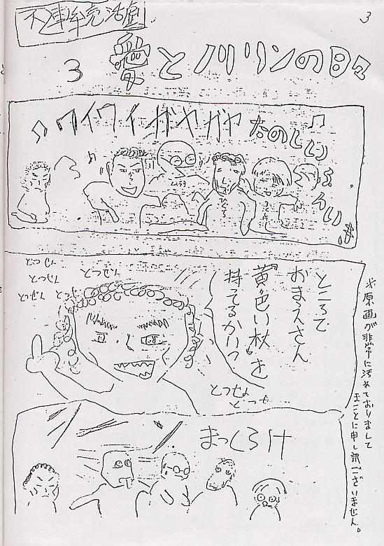と連呼しました。これによって海老名家でのウナギという食べ物のポジションがわかりますね。さて、出てきたのはどうもスーパーのパック売りのウナギでした。なぜならやや固めだったし、一緒に出てきた汁も肝いりでなく単なるかきたま汁だったからです。まあ、玉子のかきたま汁も美味しかったので、海老名にその旨を伝えると、海老名はさもうれしそうに「うちのパパは料理が上手い」と自慢しました。まあ、飯も食ったし、とりあえず元も取れたので(注15)、私は帰ろうとして立った所、奥でお父さんがもぐもぐ食べているものが見えました。おかずはウナギではなくて、何と漬物だったのです!!お父さんは息子の大事な友人の私に自分のウナギを与えてくれたのです。ボクはとても感動して海老名君にやさしくしようと決意しました。