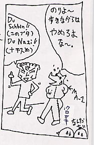 (注3)ドゥーシュバイン、ドゥーナチ……ドイツ語のリーダーに本当に例文として載せられていた。確か、夜中に主人公の家がノックされ、「ドゥーシュバイン(このブタ!)、ドゥーナチ(このナチス)と叫ばれるという話で、『このように現在もなおナチスのキズアトはドイツに残っています』と、教官(ターヘル中島というあだ名だった)は語った。なお、この先生、脱線が得意で、この時も『ナチスのキズアト』について延々としゃべりおもしろかった。