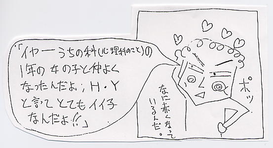 黒:当時のことをもう少し話しましょう。私はK君と(注5)よく異性の事について話し合いをしたものです。自分で言うのもなんですが、我々の会話には結構リアリティがあったと思います。ところが、そのかたわらで頑張って異性ネタを話す海老名はまさしく徳川埋蔵金があると言い張る糸井重里氏そのものだったのです!!