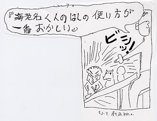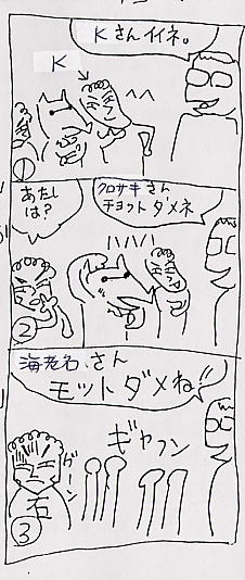 「Kサン、イイ。ヤサシイ。女の子ニモテルネ」と言いました。突然の発言でしたが、私はPさんの人間観察能力に感心したのです。すかさず、「オレはどうですか」と聞いたら「クロサキサン、チョットダメネ」と言ったので、皆大笑いしましたが、そこでよせばいいのに海老名が「あたしはどうですか?」と問うたところ、「ああ?海老名さん、モットダメネ」と言ったのです。