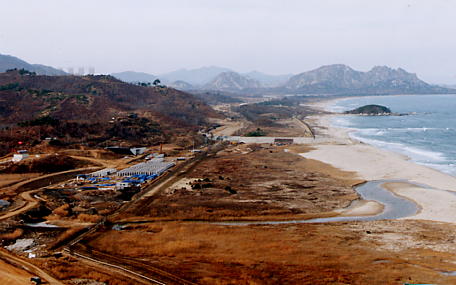 神渓川に架かる橋を渡ってまもなく、バスの進行方向左手の丘で、数十人の紺色のトレーナー風作業着姿の北朝鮮作業員と、韓国側の重機が共同作業をしている場所がありました。北朝鮮の作業員の中には、例によって真新しい白いヘルメットをかぶっている人もいました。作業内容は丘のスロープにあるでこぼこを削り、滑らかにするような作業です。どうも2003年12月中(後のニュースによると31日)にオープン予定とされている金剛山雪遊び場の工事のようでした。ゲレンデになると思われる場所の傾斜はゆるやかでまた長さも短く、とりあえずリフトも作られないようなので、そり遊びと簡単なスキーが楽しめる場所になると思われます。
