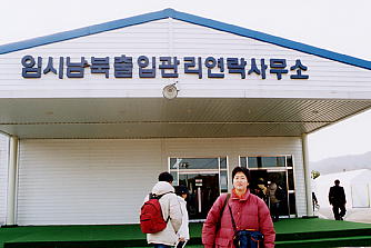 さて、金剛山陸路観光に出発する統一展望台に着きました。統一展望台下の駐車場隣には、雪峰号が出発する束草の現代ターミナルに似た建物がありました。どうもこの建物で韓国の出国手続きが行なわれる、出入国事務所のようです。また、統一展望台の駐車場には多くの観光バスが駐車しています。これから金剛山に行く観光客を乗せてきたバスもありましたし、これから金剛山帰りの客を乗せるバスもあったようでした。効率がよい場合、統一展望台まで金剛山行きの客を乗せて、同じバスが2日前に金剛山へ向けて出発し、今日金剛山観光から帰る客を乗せて帰ることもあるようでした。