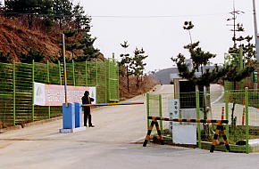 やがて道はまた登りとなり、すぐにまた下りにかかります。金剛山観光で使われている南北間の臨時道路の韓国側はかなりアップダウンが多い道路です。やがて道はかなり急な登りとなります。登りきったところで、進行方向右側に入っていく道がありました。どうも右側を行くと小高い山の山頂の方に向かい、そこには韓国軍の監視所があるようでした。また、ここの場所には韓国軍が警備をしていて、バスの車列に向かって敬礼をしていました。