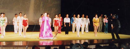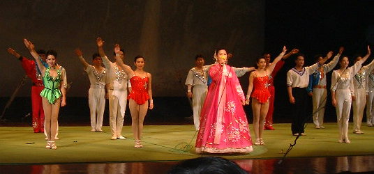 午後8時半、サーカスはフィナーレを迎えます。平壌モランボンサーカス団の皆さんは、例によって舞台に並んでご挨拶です。韓国からの金剛山観光客の皆さんは、これも例によって立って声援を送ります。BBCのカメラはそんな光景をおさめようとカメラを廻しつづけます。