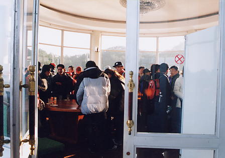 丹楓館で一番大きい、湖を望む円形の部屋の中ではなにかやっているらしく、みんな争うように部屋の中へと入っていきます。もちろんのりまき・ふとまきも金剛山観光客でごった返す丹楓館の湖を望む円形の部屋に入ってみます。