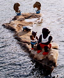 「こんにちは」。またまた挨拶です。女の子は同じバスに乗ってきた小学生高学年くらいの男の子が一緒でした。男の子はまったく日本語がわからないのですが、三日浦湖畔までなんやかんやとみんな一緒に降りていきます。湖畔に到着すると皆で記念撮影です。そしてのりまき・ふとまき二人の記念撮影の番になると、女の子は「ハイ、チーズ!」と声をかけます。う〜ん……