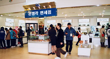 温井閣内の免税店。プラダやシャネルの看板が見えます