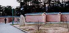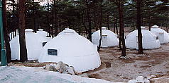 金剛山温泉の敷地には、金剛山観光の宿泊施設である温泉ビレッジの建物が並んでいます。また、奧の方にはジオドームという10人程度の団体客用の白いドームが並んでいました。地面に並んでいるジオドームは、何となくSF映画かなにかで見るような宇宙人の地球侵略基地のような感じもして、面白いです(^o^)。