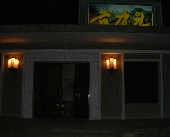 金剛苑正面の看板は、金剛山の写真の上に黄色いハングル文字で『金剛苑』と書かれた真新しい看板でしたが、建物そのものはかなりの年代モノです。そうしているうちに、私たちの乗ってきたバスを追いかけるように、2台のバスがやってきました。結局、金剛苑の北朝鮮特別料理を食べに、全部で3台のバスに乗って金剛山観光客がやってきたことになります。到着すると皆、続々と金剛苑に入っていきます。さあ、私たちも金剛苑に入ってみます!