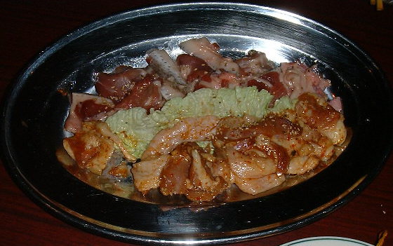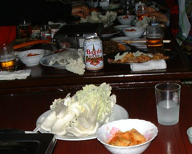 食卓に座ると、目の前に生の白菜、コチュジャン、キムチ、トラジ(キキョウ)とぜんまいの付け合せ、さらに黒豚とアヒルのカルビがすでにセットされていました。生の白菜はどうして食べればよいか少しまごつきましたが、みんなコチュジャンをつけて生のままむしゃむしゃとやっています。私たちもまねして生の白菜をコチュジャンをつけて食べてみると、意外と白菜の甘味が感じられて美味しかったです。