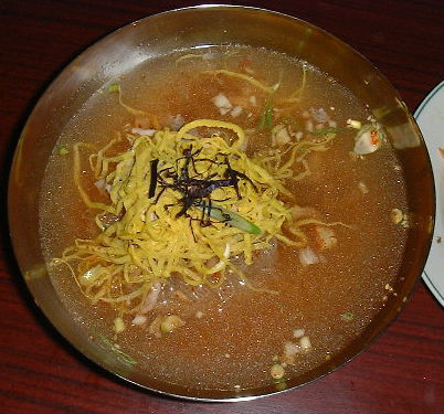 私たちがトイレから戻ってまもなく、店員さんは冷麺を運んできました。最後の冷麺は大変に細い麺を使っていて、これまで食べたことがない冷麺でした。上品かつ繊細な味付けのこれもまた絶品でありました♪♪