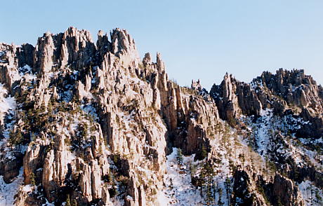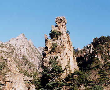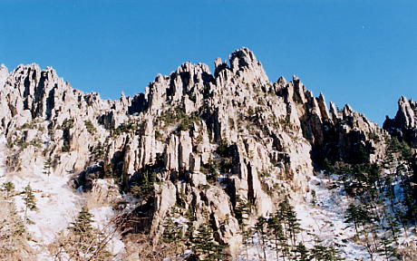 厳しい下りが一段落したところに安心台という展望台がありました。安心台からは万物相の勇姿を振り返ることができました。安心台を過ぎるとまた急な下りがしばらく続き、七層岩と切斧岩が見え出すあたりまで下って、ようやく道の傾斜がゆるやかになり、道沿いから雪も消えて一安心です。