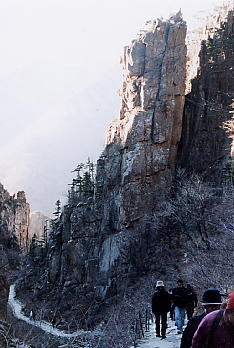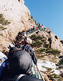 道は一本道で、しかも大勢が一斉に登るので、自然と行列になってしまいます。それにしてもなかなか行列が先へと進みません。見ると道のあちこちが凍結していて、凍結箇所の通過に時間がかかってしまっているのでした。金剛山観光客には高齢の人も多く、かなり険しい万物相コースを観光客全員に堪能してもらうこと自体、無理があるような気がします。