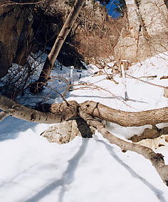道はこれまで歩いてきた道と異なり、主に日陰を歩くようになります。すると当然、残雪の量が増えてかなり滑りやすくなってきました。やがて道は天然の門、ハヌルムンをくぐります。どうも万物相探勝コースは一方通行の周回コースとなったようです。ハヌルムンをくぐると、さらに雪の量が増えます。道は雪に完全に埋もれていて、雪が凍結している部分もあってひどく滑ります。一口飲めばいくら疲れていても杖を忘れるといわれる“忘杖泉”は、なんとか湧き出し口だけ雪の中から掘り出されていて、貴重なお水を少々賞味することができました。