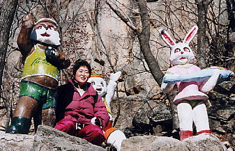 万物相の登山口から歩き出そうとすると、さっそく例によって謎の動物オブジェが私たちを出迎えます(^o^)。いったい何なんでしょう??動物オブジェを見送って先へと進むと、私たちの目の前を朴夫妻の奥さんの方が、駆け足で降りてきます。私たちの姿を見ると笑いながら「寒いからカッパ着なくっちゃ」。と言いながら、風のように坂を下っていきます。たしかに相当寒いです。寒さで耳が少し痛くなってきたのを感じたのりまき・ふとまきは、帽子を深くかぶり直します。