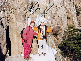 アイゼンをつけ終わってひと息入れていると、私たちの前に、昨日『男のシンボル、チンチンの形をした岩』を教えてくれて、金剛院でもお世話になった尹さんと、金剛ビレッジでの朝食でいつも一緒になった済州の安さんのお父さんの方が現れました。もちろんお互いカメラを交換しあって記念撮影を行ないます(^o^)。