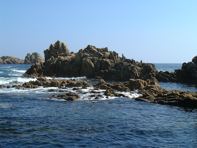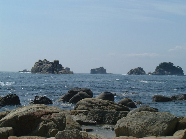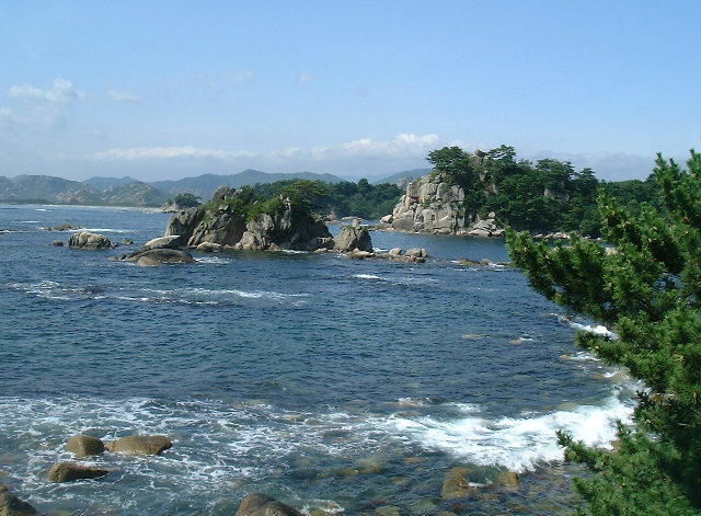 海金剛地区(1) (のりまき撮影写真集) この写真は全て2002年7月20日撮影のものです。 海金剛に咲くはまなすの花 海万物相の光景です。青い海に奇岩が映えます。 このような風景は、日本で言えばやっぱり松島かなあ? 松の緑も美しく…水もきれいですね。 水はとにかく澄みきっています。