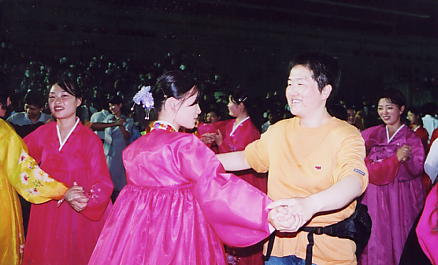 ふと、ひな壇で踊りを見ている人々を見ると、中国からの観光客の姿に混じって、夏服の学生服姿をした、大阪の朝鮮高校の学生たちがいました。今回の北朝鮮行きの前に、先日新潟港に万景峰号がやって来たとのニュースを聞いたので、万景峰号に乗って故国に修学旅行に来た、修学旅行生なのかもしれません。