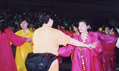 やがて写真を撮っているのりまきのところにも『踊りませんか?』と、北朝鮮の女性が現れました。こういう時は写真を撮っているよりも踊っている方が楽しいです。のりまきも再び踊り出しました。みんなが踊りつづける中、いつしか雨も止んでいました。雨上がりの少し蒸し暑い中、踊りの熱気が体全体に廻っていくのが感じられます。