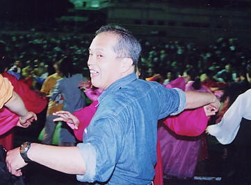 ダンスが始まってしばらく後、ひな壇から降りられるようになりました。するとみんなひな壇から降りて、近くからダンスを眺めるようになりました。するとガイドのHさんが「どうです?皆さんも踊っていませんか?」というので、のりまき・ふとまきはHさんに連れられて踊りの輪に入ってみました。
