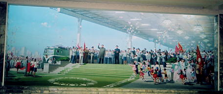 鉄道事績館の入り口をくぐると、まず壁画のようになっている巨大な絵画が私たちの目の前に現れました。この絵画、何かの式典を描いたもののようで、式典に出席した金親子を囲む華やかな雰囲気がナイスです!