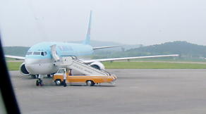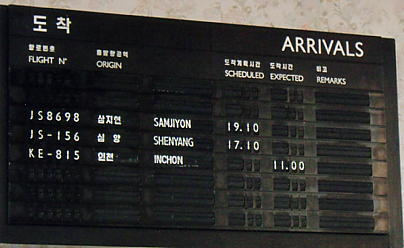 出発ロビーに着いてみて驚きました!滑走路にな、なんと韓国の大韓航空機が停まっているではありませんか!空港内の到着、出発案内板にもしっかりと“KE(大韓航空)”と、“インチョン(韓国の仁川国際空港)”の文字があるではありませんか!「どうして大韓航空機が来ているのでしょう?」と、L課長とガイドのHさんに聞いてみるのですが答えはありません(苦笑)。韓国側からの金剛山観光に参加してみても感じることですが、本当に韓国と北朝鮮との関係は謎だらけです。