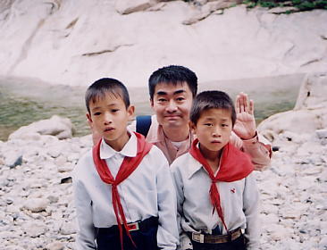 金剛門をくぐってしばらく歩くと視界が開けました。戦前の金剛山写真集などでよく見る、万瀑洞の光景です。ここから万瀑洞の渓谷美が始まるといいます。この場所になんと例の2人組の少年が先回りをしていました!何事に対しても積極性が光るSさんが、ここでも少年たちに声をかけ、先ほどに続いてポラロイドカメラで少年たちの写真を撮り、出来上がった写真を渡しました。続いてのりまきも少年たちとの記念撮影に納まります。ここでガイドのHさんが少年たちに「何歳?」と聞いたところ、少年たちは「13歳」と、答えたそうですが……朝鮮語がかなりわかるE.Tさんの話によれば、8歳の訳し間違いかもしれないとのことです。