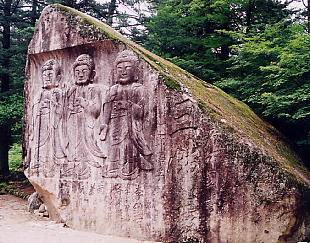 橋を渡って少し進むと、目の前に三仏岩が見えてきました。ずいぶん予想よりも大きなものです。