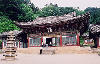 白華庵の跡を過ぎると、川の向こうにかなり大きな寺院が見えてきました。金剛山四大寺の中で唯一、朝鮮戦争での壊滅を免れた表訓寺です。この寺も朝鮮戦争で大きな被害を受けたのですが、一部の建物は焼失を免れ、主要な建物は再建もされました。