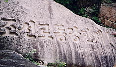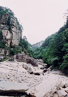 道はやがて渓谷に入っていきます。道は時々吊り橋を渡りながら進んでいきます。吊り橋は渡ると結構ぐらつく上に、板もところどころ外れていたりしてかなりスリルがあります。また、このあたりから北朝鮮の国花である、モンラン(オオヤマレンゲ)の花が咲いている光景が目につくようになりました。モンランの芳香が時々、私たちのところまで漂ってきます。また道を歩いていると、リスが結構頻繁に姿を現します。しかしそんな中、外金剛にあったのと同じような、岩に刻まれた政治スローガンの文字が飛び込んできます(-_-メ)。