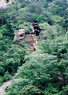 渓谷はきれいにはきれいなのですが、正直いまいちぱっとしません。外金剛よりもやはり全体的に緑が濃く、『外金剛は男性的、内金剛は女性的』と言われるのもよくわかるのですが、外金剛に較べて美しさのキレがなく、これでは外金剛の玉流洞の方が上かな?と思い出した頃、銅の柱で絶壁に立つ庵、普徳庵が見えてきました。このあたりになると、渓谷にある淵のエメラルド色も深みを増し、ようやく外金剛に負けない、内金剛万瀑洞の実力が発揮されてきた感じがします。