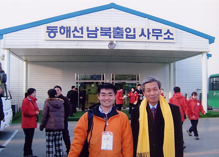 韓国の東海線南北出入事務所(出入国管理事務所)前で、現代峨山の金潤圭社長とのりまき