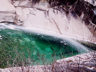 防寒対策は万全だと思っていましたが、寒いです!やはりもうすぐ一月……甘くはありませぬ。足先からじんじんと冷えてくる感じです。これまで11月〜12月初めに2回、九竜淵コースを歩きましたが、その時よりも明らかに寒く、流れはほとんど凍っていました。特に澄んだエメラルド色をした凍れる淵は大層美しかったです。