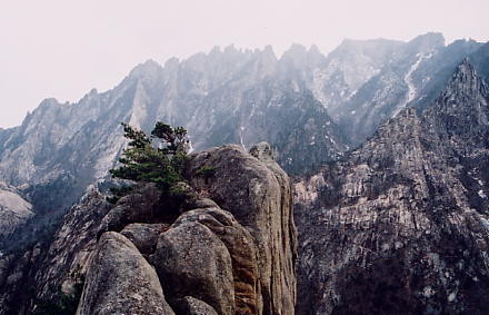 あえぎあえぎ登りますが、なかなか頂上まで着きません。もともとはっきりしない天気でしたが、この頃には小雪が舞い始めました。寒いのですが小雪が舞う金剛山もなかなか風情があります。登りはじめて約三十分、ようやく九竜台の頂上に到着しました。上八潭を見下ろしてみると、今回はすっかり凍っており、しかも粉雪に覆われて白くなってしまっていて、少々期待はずれでした。しかし正面の世尊峰は冬山らしい荒々しさを見せていて、実に見ごたえがありました。