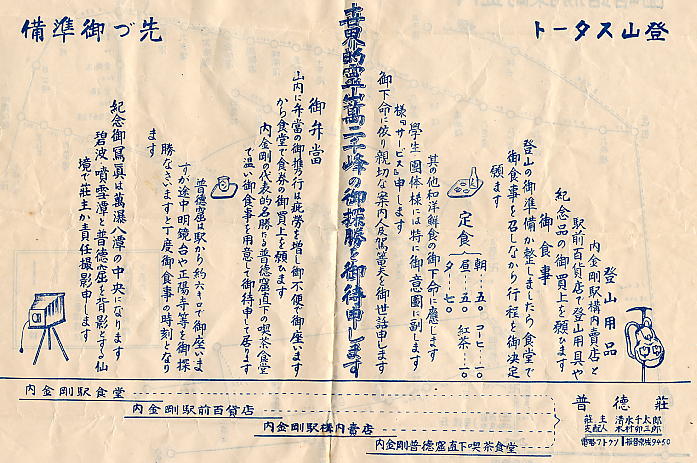普徳荘チラシ 普徳荘は、内金剛・万瀑洞の普徳庵そばに茶店『普徳荘』 内金剛駅前の百貨店・食堂『普徳荘』 そして内金剛駅構内の売店『普徳荘』を経営していたようだ。 それにしても……茶店・百貨店・食堂・駅の売店、全部の屋号が『普徳荘』とは…